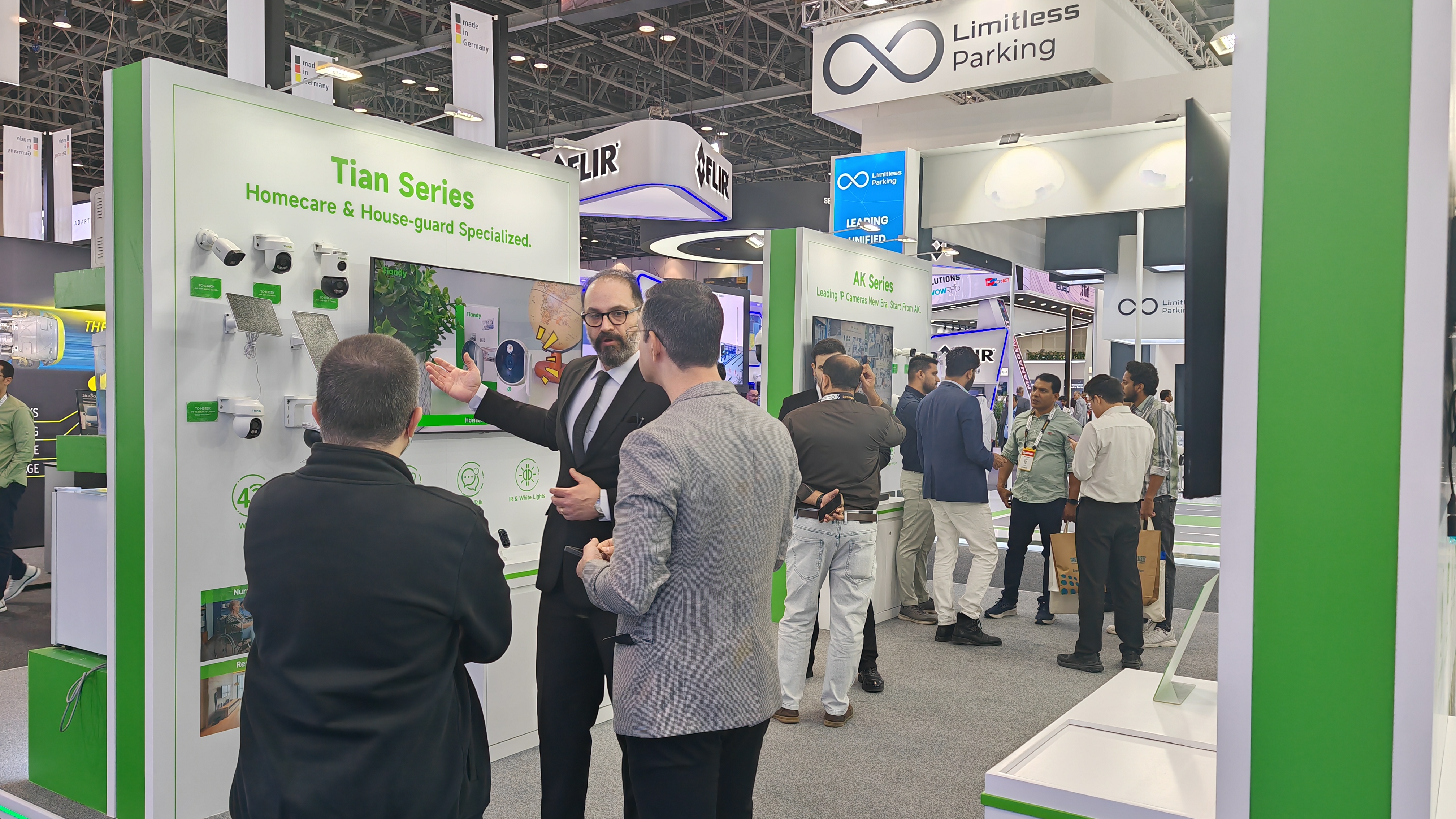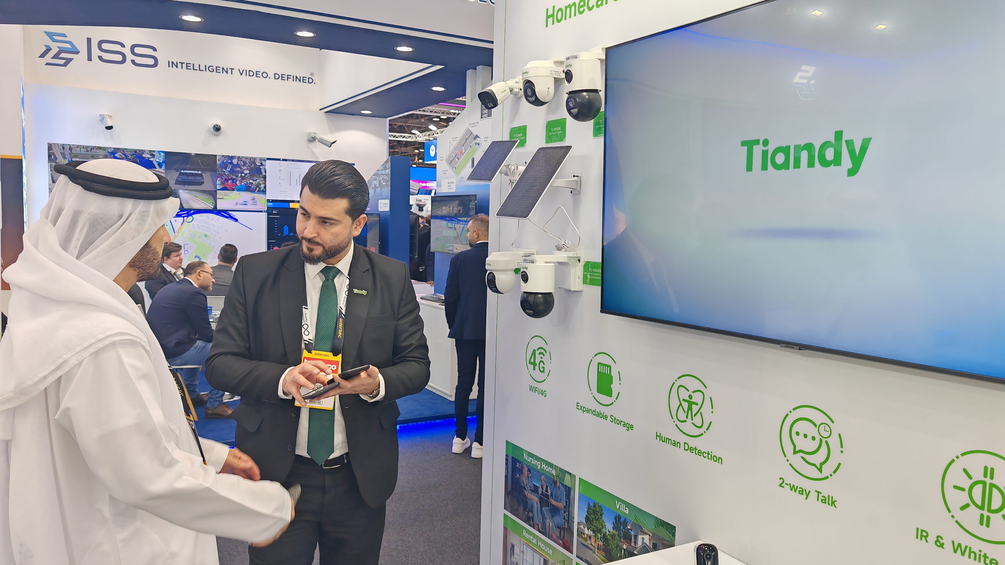 为应对全球市场多元化的需求,天地伟业本次重点展示了60余款核心产品,全面覆盖家用摄像机、项目型摄像机、AI大模型录像机、All in One服务器四大产品线,致力于提供从基础安防到高端智慧城市建设的全栈式解决方案。各地客户结合自身需求关注着不同产品,但都不约而同地为天地伟业的产品实力点赞。欧洲客户对LK系列在复杂光线下的出色表现与AI智能分析能力表示赞赏;非洲客户对无电无网摄像机兴趣浓厚;海湾地区工程师则更关注SK、LK系列在极端环境下的稳定性以及All in One服务器的便捷部署。此外,Tian系列及K系列所体现的高效中心化管理能力,也吸引了众多寻求消费升级与商业效能提升的客户。