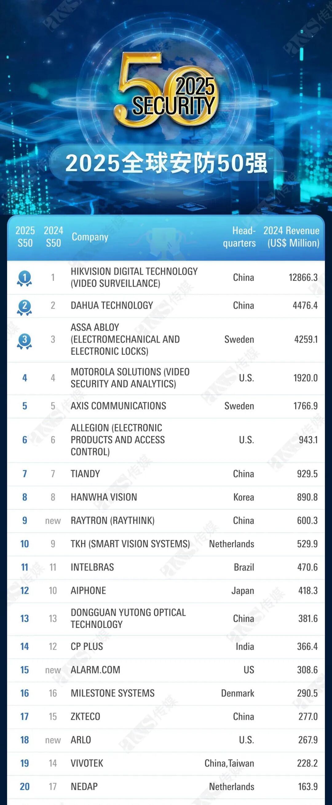 刚刚,法兰克福a&s正式发布“2025全球安防50强”榜单。天地伟业凭借扎实的技术能力、稳健的市场表现、卓越的品牌影响力,位列全球安防50强第七名。