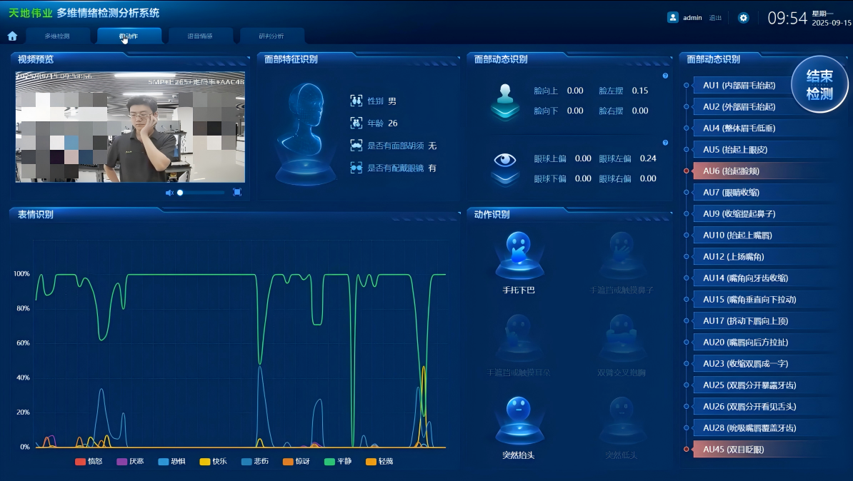 以微表情为情绪核心,通过卷积神经网络深度学习算法,精准识别惊恐、愤怒、悲伤、紧张等十二种核心情绪及配合、中性、抗拒等三类心理状态。系统基于普通心理学认知理论,捕捉被审查对象面对特定线索时的潜意识情绪波动,通过折线图可视化呈现心理认知波动轨迹,清晰标注可疑反应节点——无辜者面对犯罪情景刺激无明显唤醒反应,而涉案人员会出现自主唤醒引发的情绪异常,为说谎识别提供客观依据。同时,结合面部动作单元(AU)18种核心动态检测,穿透表层情绪伪装,直指真实心理内核,避免人工判断的主观偏差,精准指引侦查方向。